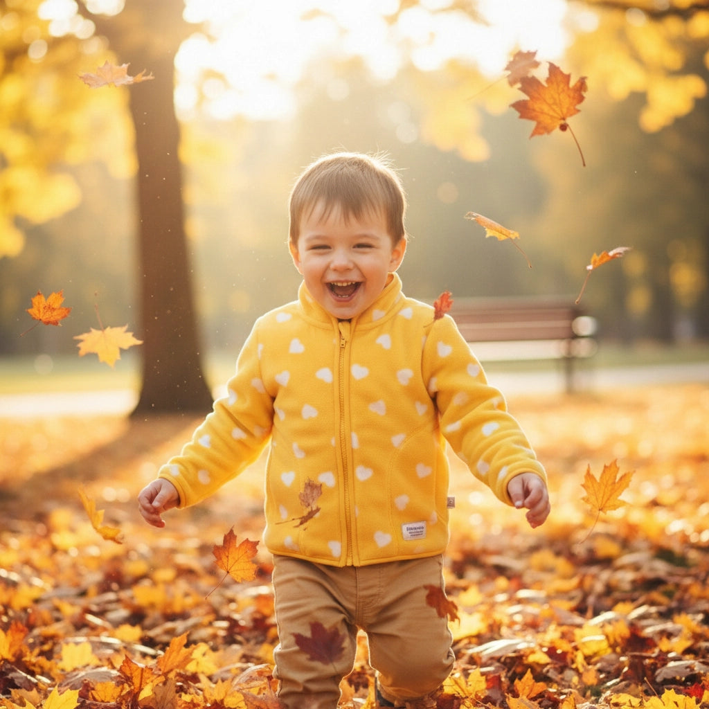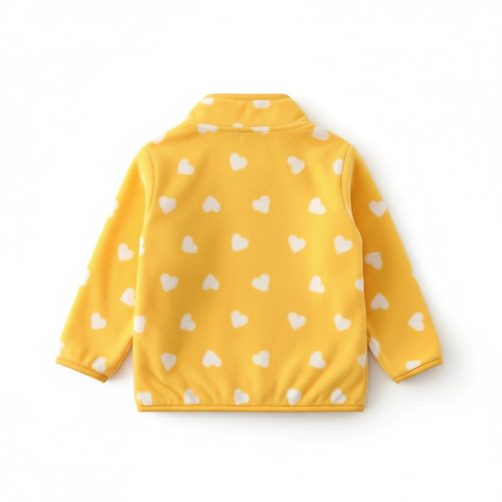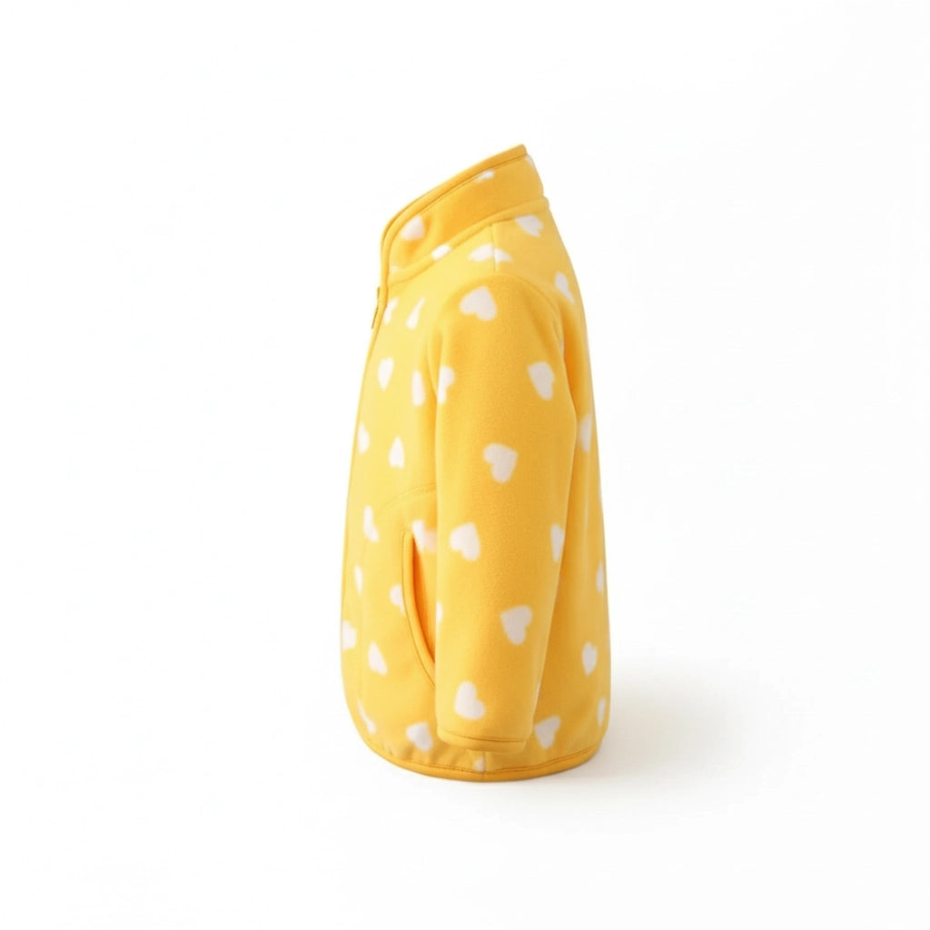 Det gula tyget med hjärtan gör plagget unikt och roligt. En jacka som barnen älskar att bära tillsammans med vänner.