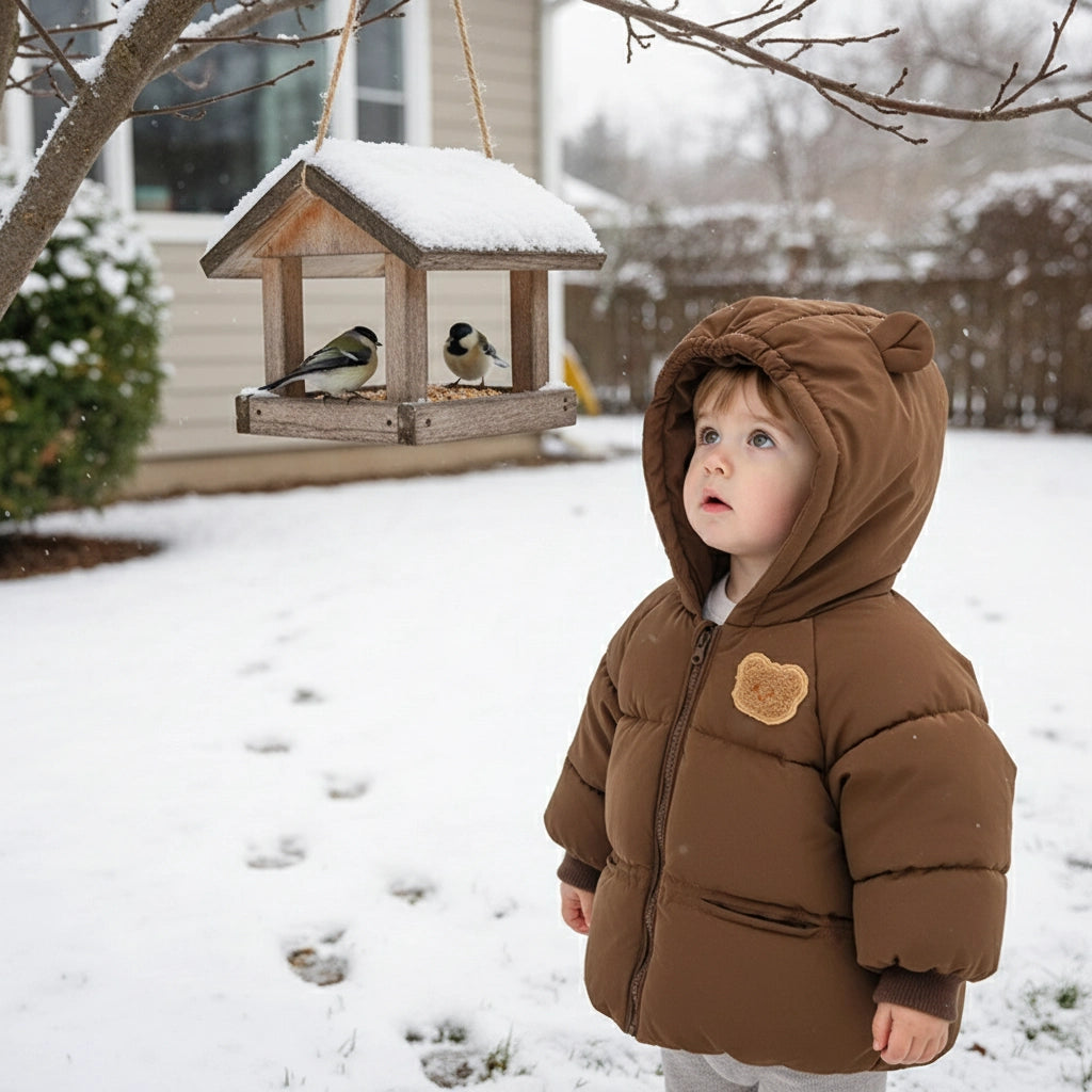 Låt ditt barn omfamnas av värme och charm i vår bedårande beige björnjacka! Med sin mjuka, molnlika textur och gulliga öron på huvan, blir den snabbt en favorit för både föräldrar och små. Den vadderade designen håller kylan ute medan den gulliga björndetaljen på bröstet sprider glädje. Praktiska fickor ger plats för små skatter, och de elastiska ärmsluten håller snö och vind borta. Perfekt för allt från vinterpromenader till snöänglar i parken. Den ljusa beige färgen matchar enkelt med alla outfits och håller sig fräsch säsong efter säsong. Ge ditt barn en kram av värme och stil med denna förtjusande jacka som kombinerar funktion med oemotståndlig sötma!