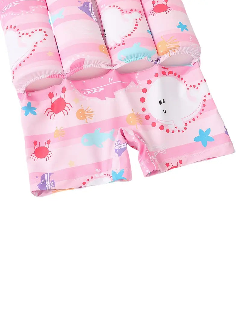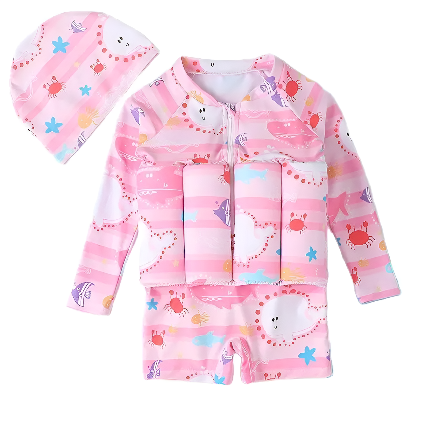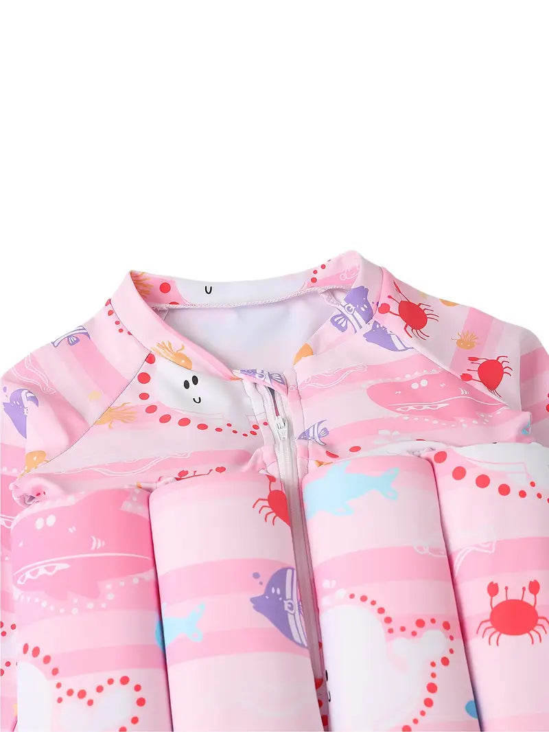 Skydda ditt barn i både stil och funktion med denna rosa långärmade baddräkt med havsdjur och tillhörande badmössa. Designad för soliga dagar och vattensäker lek – den erbjuder ett fullt UV50+ skydd, flytkuddar, samt täckning för armar och huvud.