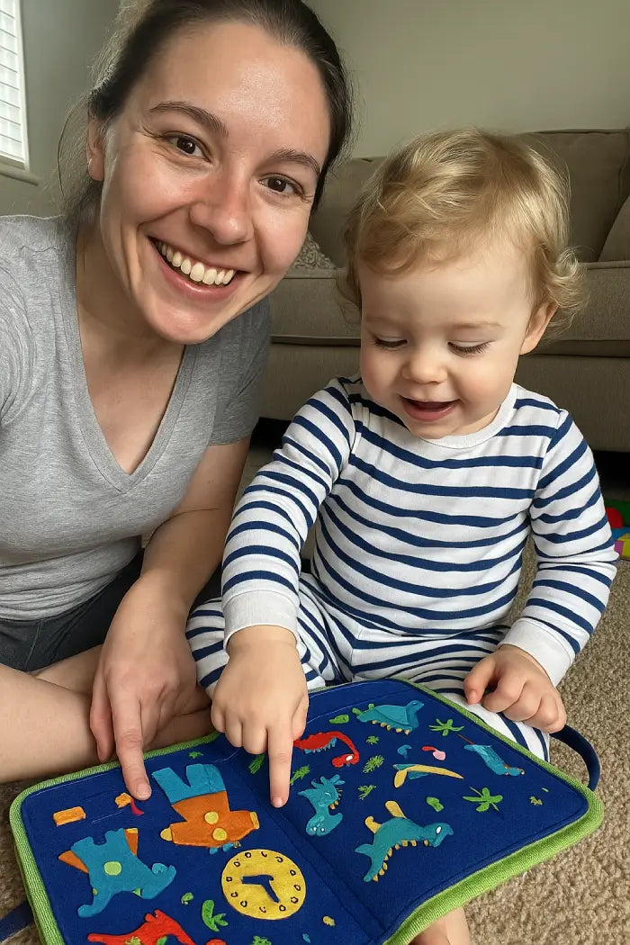 Johanna och Leo"Min son älskar att börja dagen med sin aktivitetsbok! Den håller honom sysselsatt och nyfiken varje gång. Vi älskar att sitta tillsammans och leka. Han lär sig knyta, räkna och peka ut djuren. Den är verkligen både rolig och lärorik."