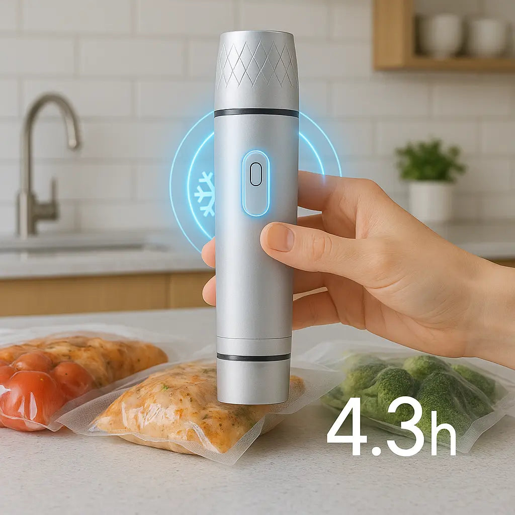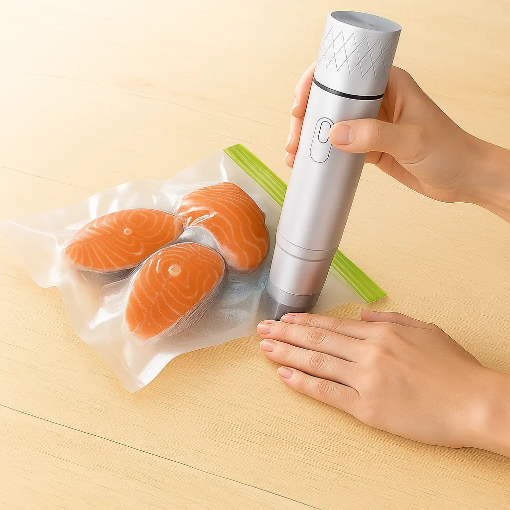 Organisera din vardag och förläng matens hållbarhet med denna vita mini vakuumförslutare – perfekt för föräldrar, hemmakockar och matförvaring på språng. Den portabla designen gör att du snabbt kan vakuumförsluta barnmat, snacks, frukt, kött eller rester utan stora maskiner eller bullriga apparater.